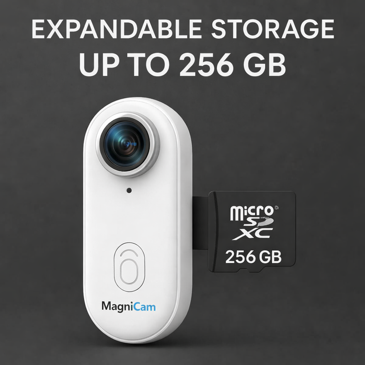 It supports MicroSD cards up to 256 GB for extended recording sessions.